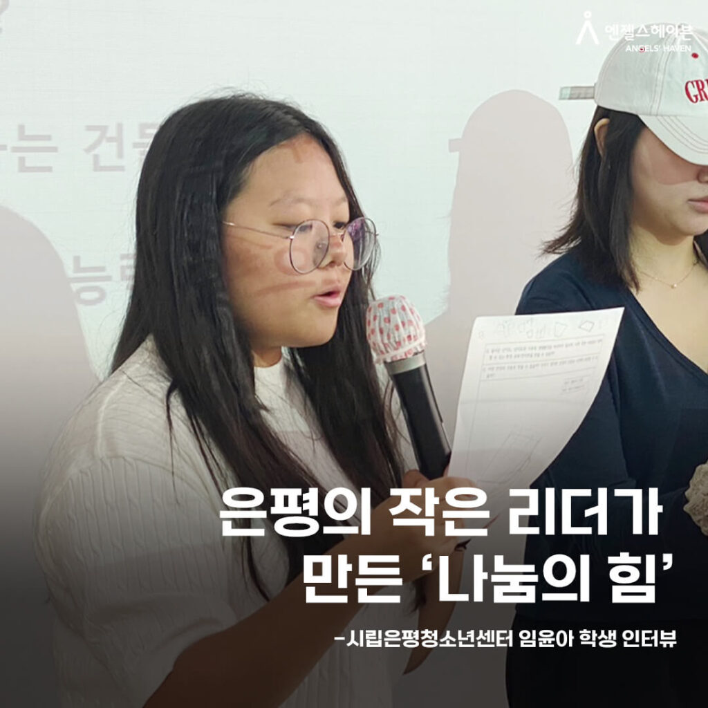 윤아 학생의 인터뷰에선 ‘함께 자라고, 함께 나누는 마음’을 엿볼 수 있었습니다. 무대에서, 동아리에서, 봉사의 현장에서 피어난 윤아 학생의 나눔은 더 많은 청소년들의 성장으로 이어질 것입니다. 시립은평청소년센터는 윤아 학생과 같은 청소년들이 자신의 꿈을 향해 자라나며, 더불어 살아가는 법을 배우도록 다양한 프로그램과 활동을 제공하고 있습니다. 엔젤스헤이븐은 은평청소년센터와 함께 오늘도 아이들이 배우고, 도전하고, 나눌 수 있는 길을 묵묵히 닦겠습니다.